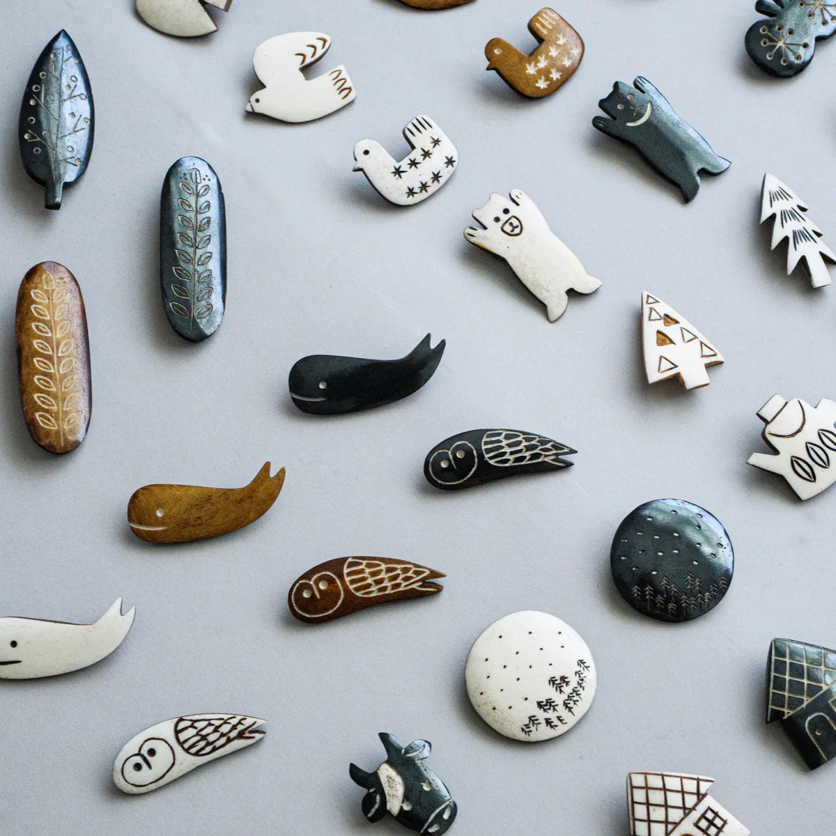 Founded in 2014, the Japanese brand LIVE IN PERFECT UNION has been committed to collecting discarded leather, bones and felt and making them into different products. While reducing unnecessary waste, it also creates new value for these once-ignored waste materials. Its factories are located in Thailand and Nepal, providing fair and reasonable employment opportunities for local people. This brooch is carved from buffalo bone. Each one is hand-painted using an electric milling machine to add patterns to the surface and then polished. The brooch is then glued together in Japan, making each one unique.