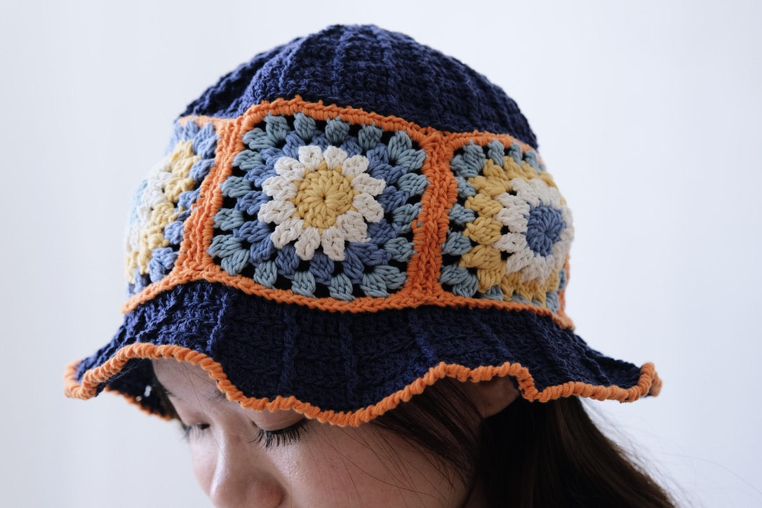 採用日本進口棉線編成一塊塊花片,組成一頂花帽子,適合春夏配搭。色彩斑斕的花