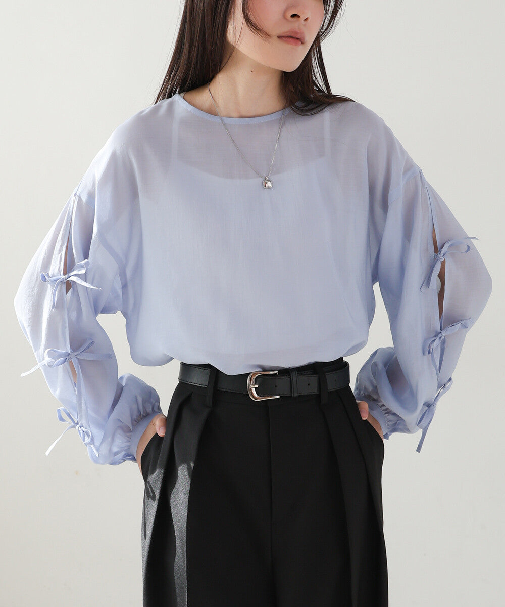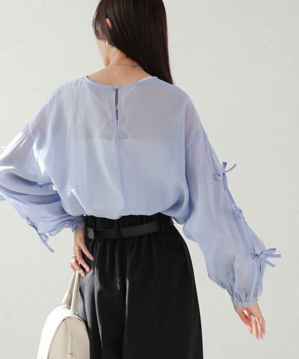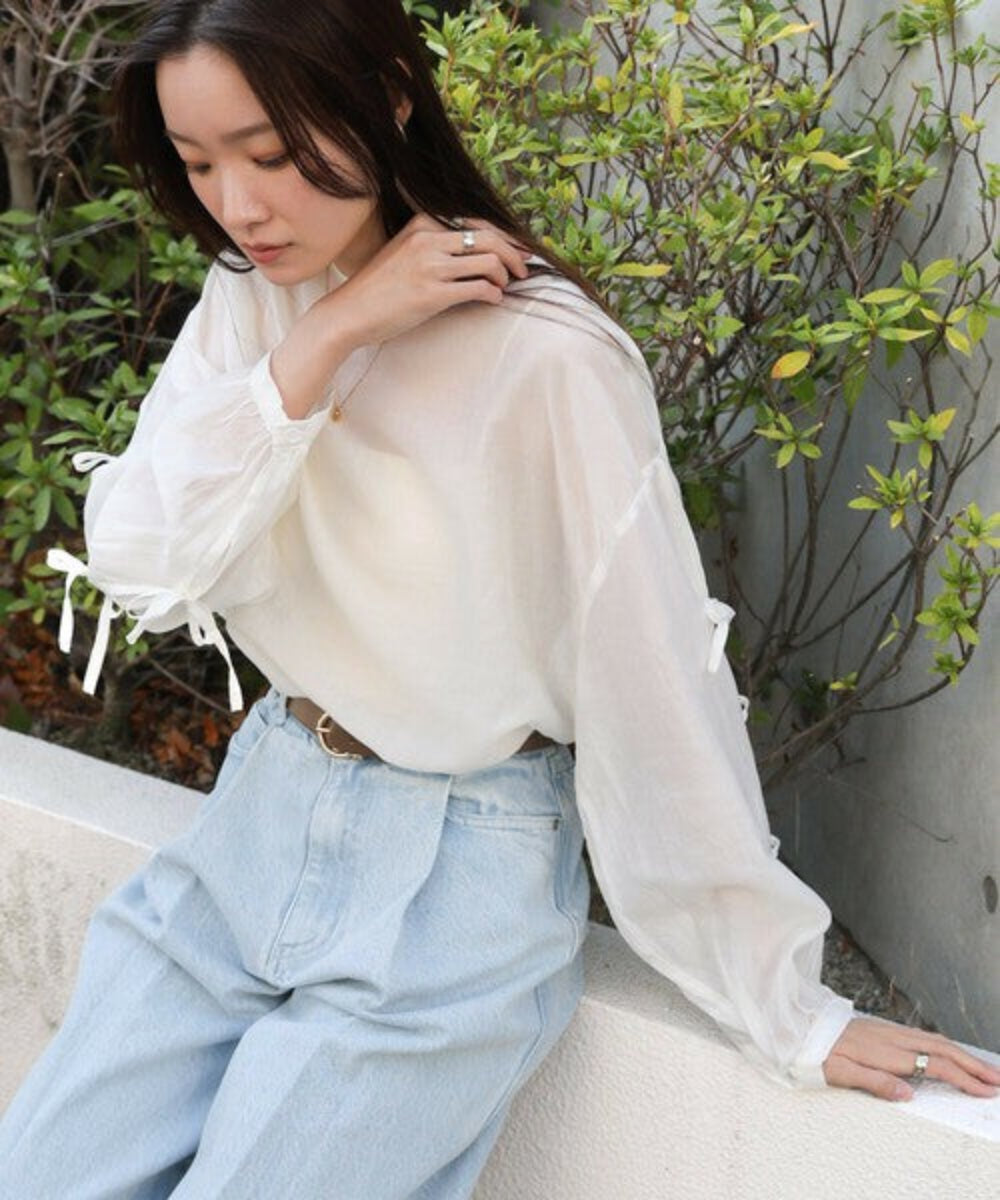 這款充滿春日氣息的襯衫採用半透明設計,袖口飾有緞帶。柔軟閃亮的布料凸顯了女性魅力。寬鬆的版型也十分吸引,落肩設計不顯身材曲線。即使將襯衫束進褲腰,及腰的長度也能給人安全感。柔和的淺色調更能展現成熟優雅的氣質。