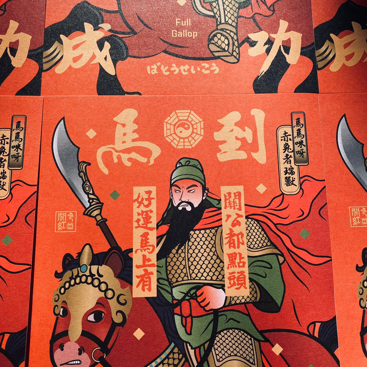 參考傳統關聖帝君對聯神明彩,置入了八卦陣、小對聯等元素,再加入浮世繪的題簽。貼在玻璃門窗時,背面還可以看年曆喔!