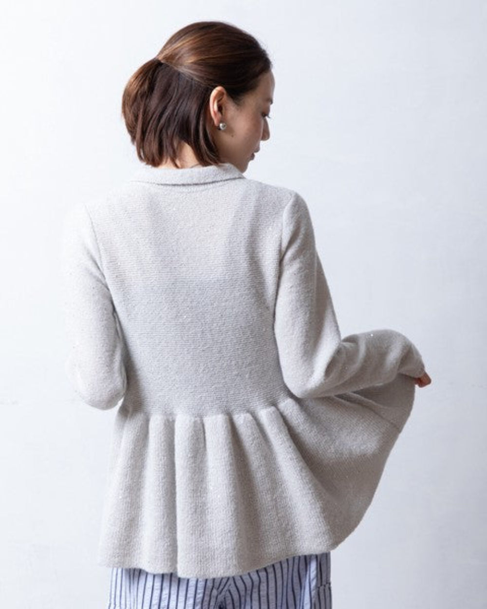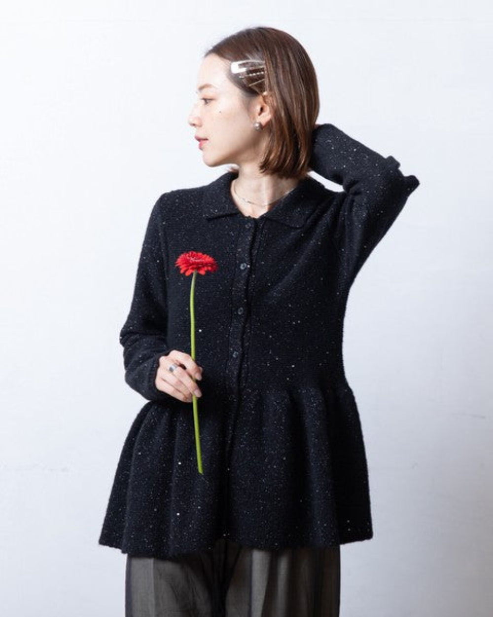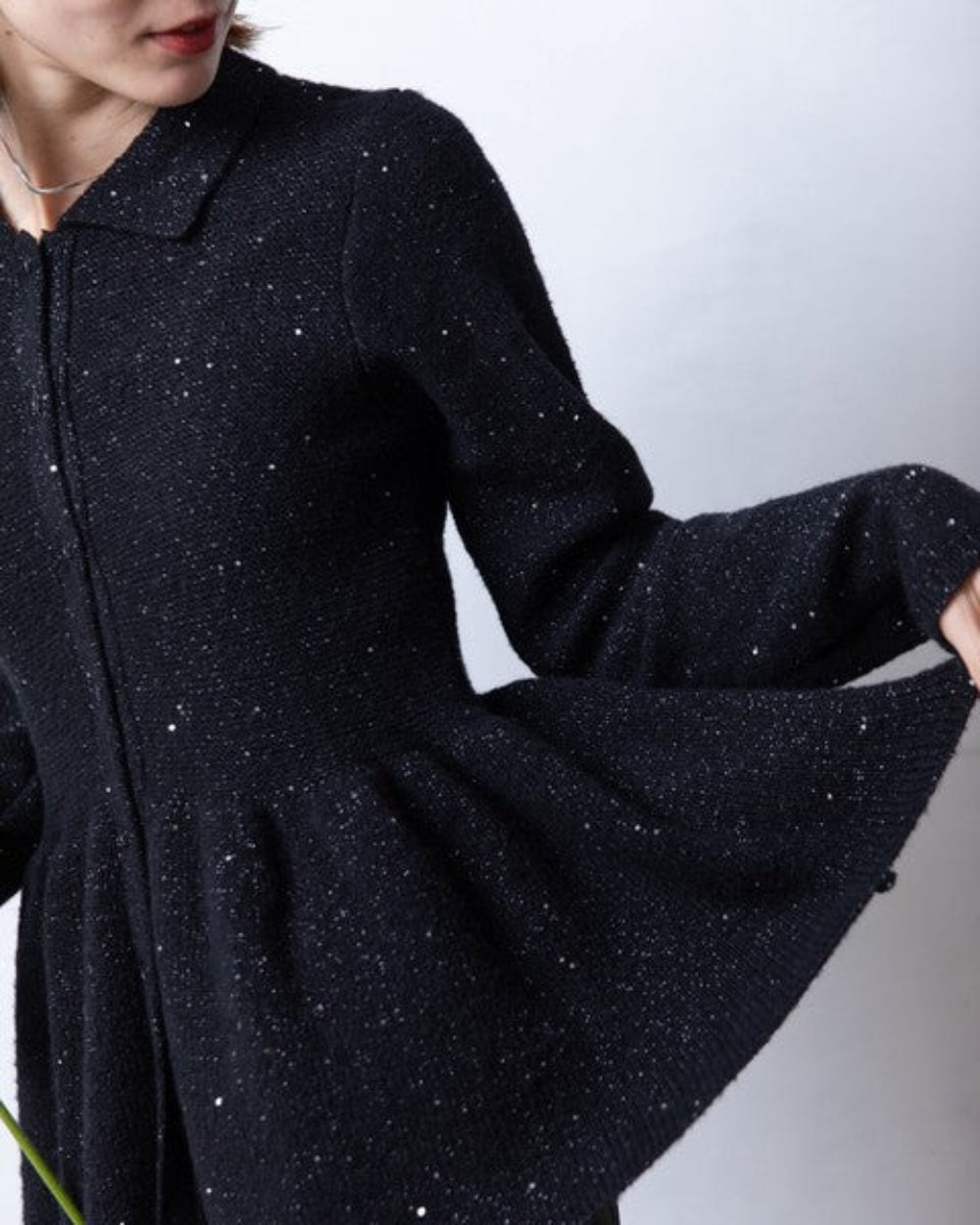 這款開襟衫的針織布料中點綴著時尚亮片,散發著優雅的光澤。從腰部自然散開的荷葉邊設計,既展現了女性的柔美氣質,也增添了時尚感。