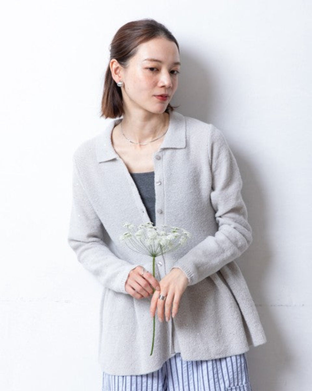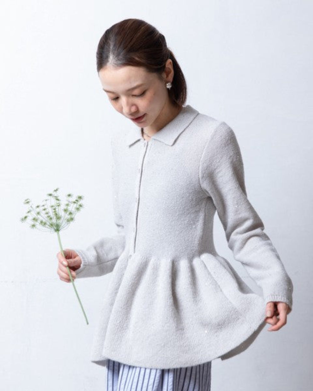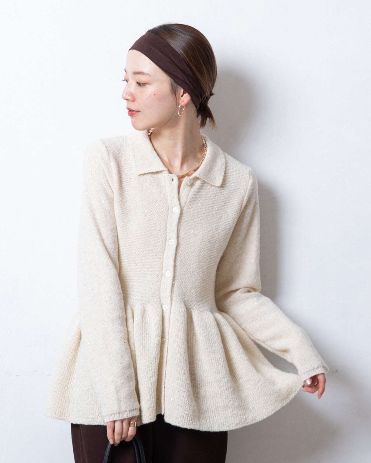這款開襟衫的針織布料中點綴著時尚亮片,散發著優雅的光澤。從腰部自然散開的荷葉邊設計,既展現了女性的柔美氣質,也增添了時尚感。