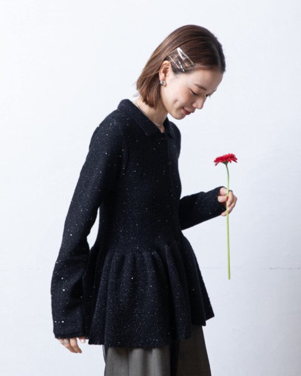 細膩的亮片織入針織布料,在光線照射下閃耀著優雅的光芒。這種光澤並不張揚,因此適合從日常穿著到派對等各種場合。高腰設計,下擺呈喇叭狀展開。荷葉邊遮蓋了後腰,打造出迷人的曲線。袖子和衣身採用適度修身的剪裁,與蓬鬆的下擺形成鮮明對比,同時也有助於拉長腿部線條。