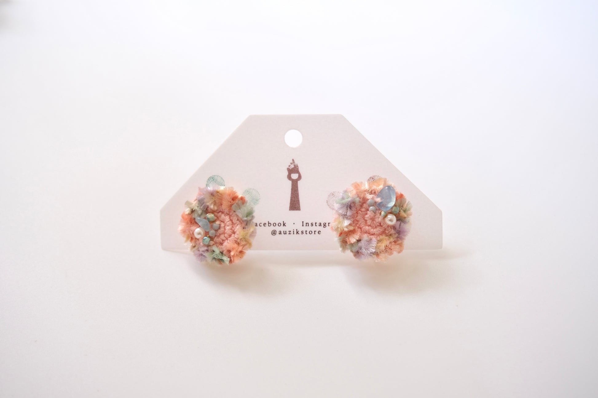以麻線和混合線鉤織成圓圈,再配上可愛的日本串珠/天然石等,搭配925純銀耳針/耳夾。
