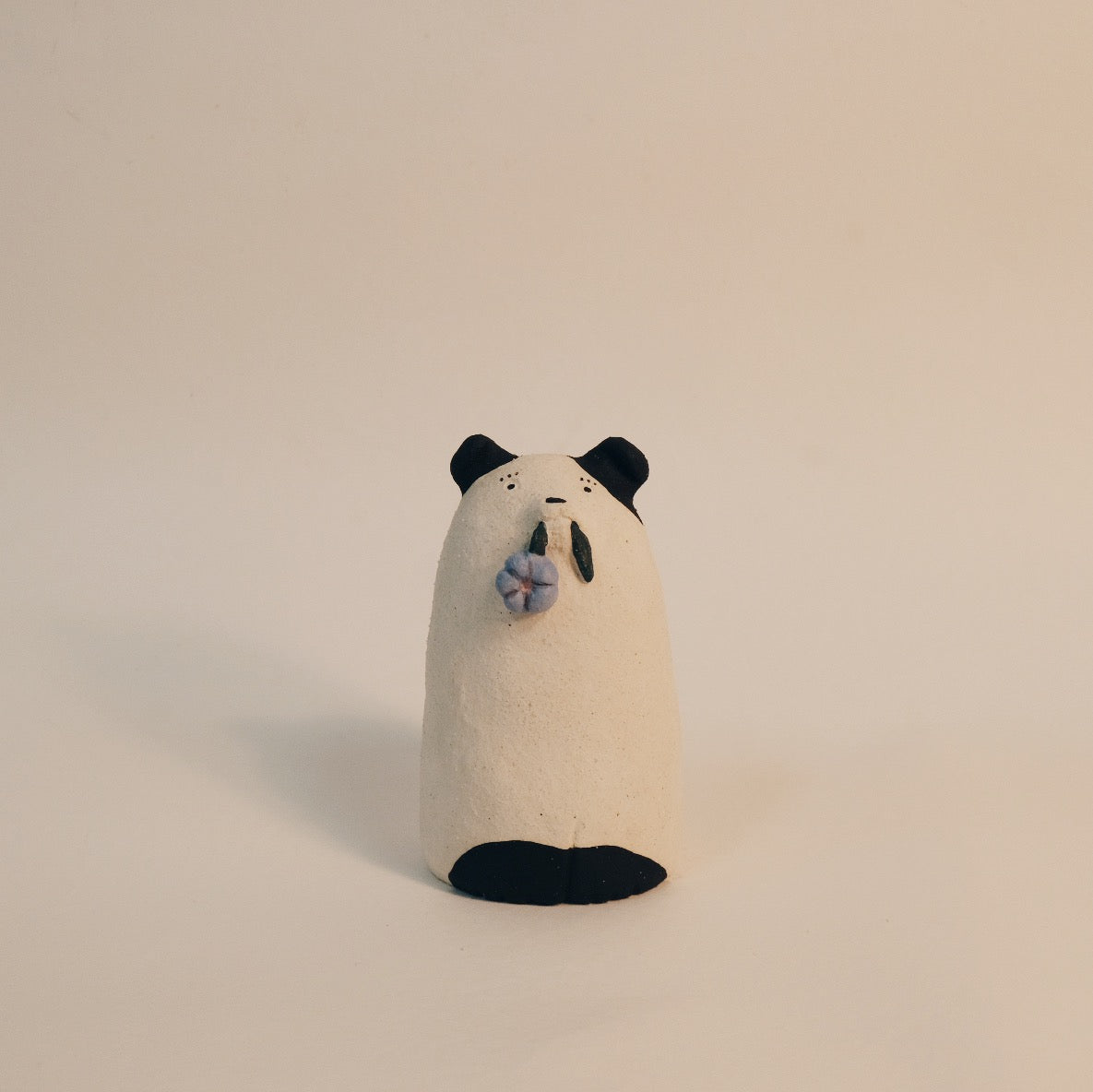 手捏小陶偶,以陶瓷顏料上色,燒至1230度,有些土內有小石頭,燒完作品表面會呈現不同的質感