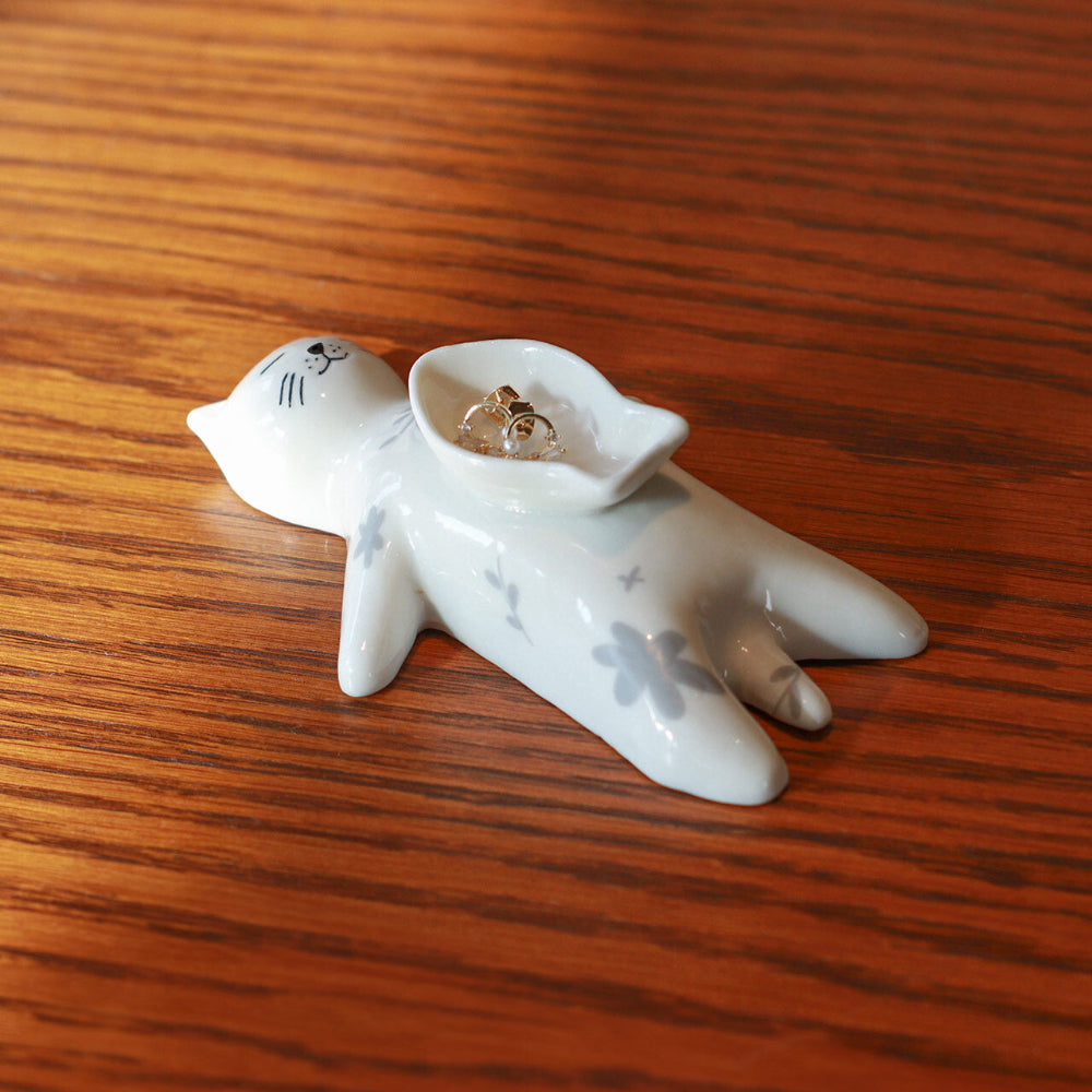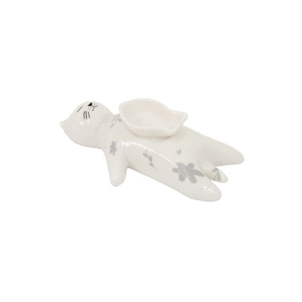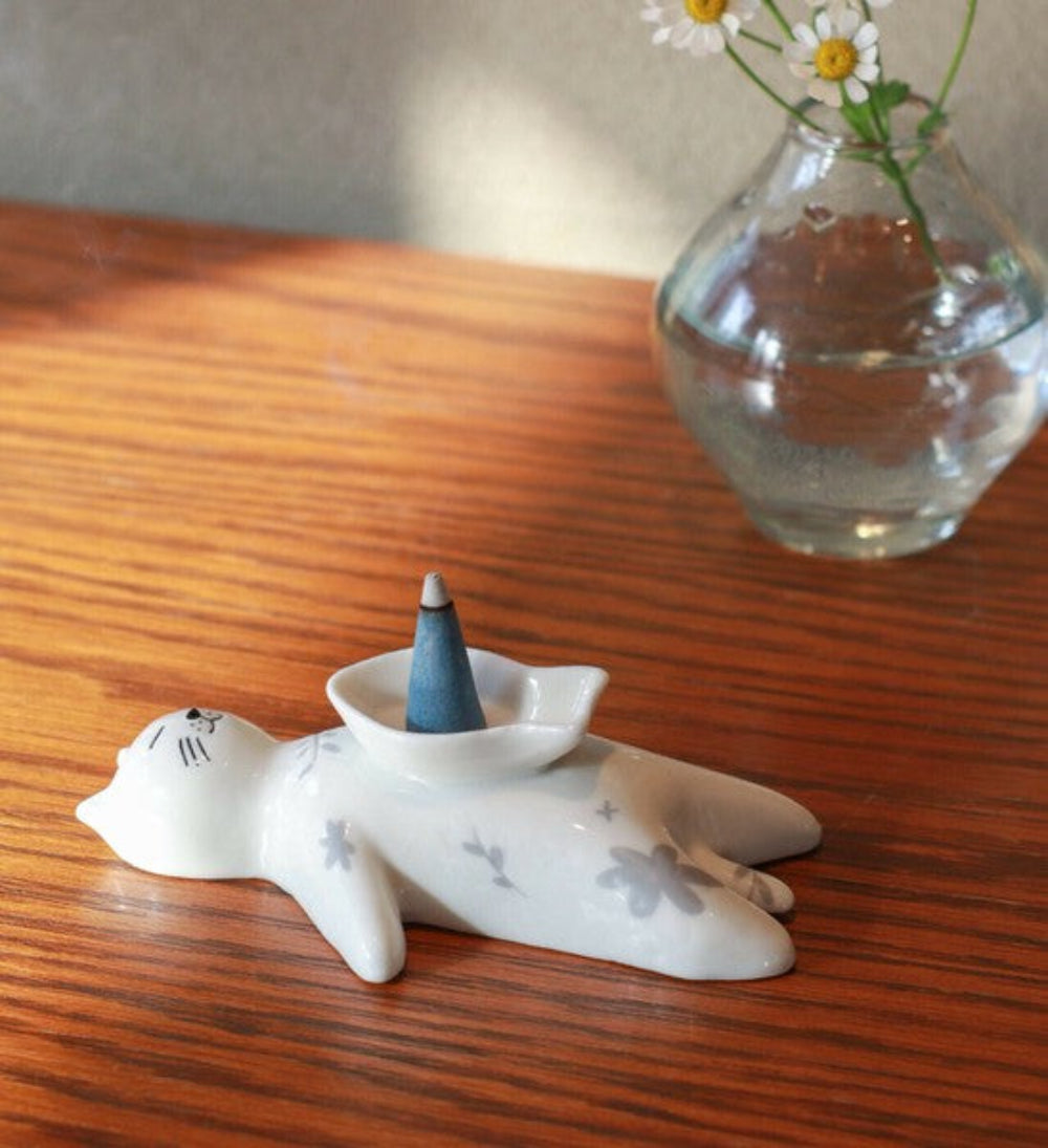 這款瓷質貓咪香爐飾有精美的花卉圖案。將香錐放入臥貓腹部的魚形容器中,享受淡淡的香氣帶來的舒緩放鬆。