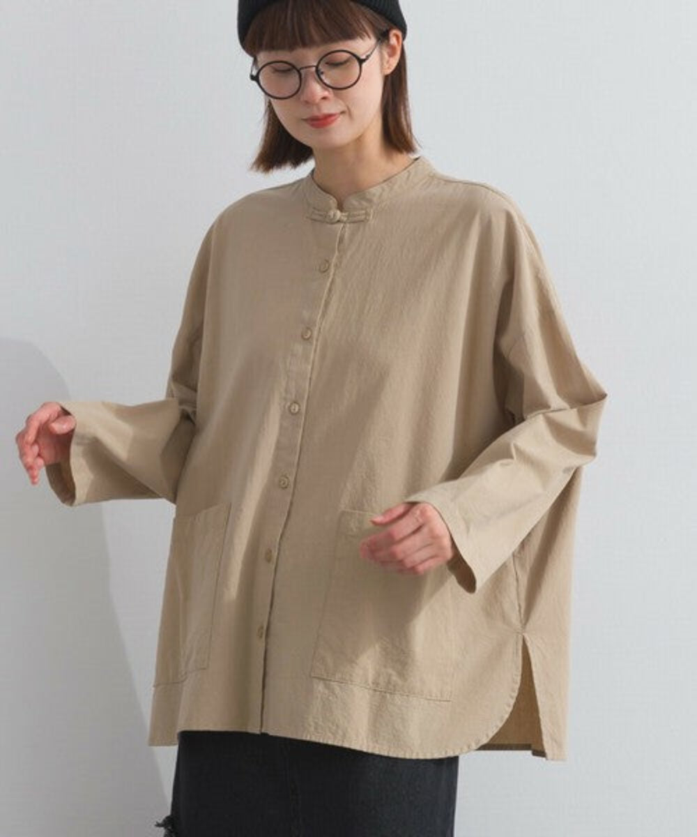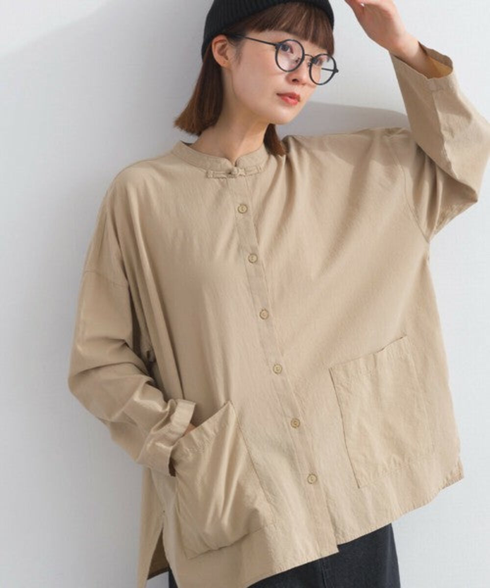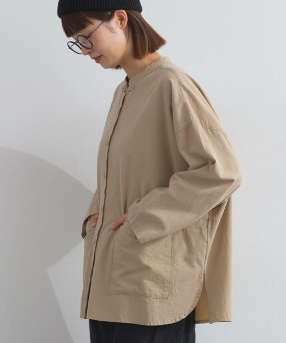 這款中式領襯衫採用略帶絨面質感的純棉布料製成。純棉布料的天然褶皺賦予其柔軟而不僵硬的外觀,布料的柔軟度也體現在其觸感上。除了棉質布料特有的輕盈質感外,觸感也十分溫暖舒適,表面彷彿經過水洗處理,穿著即可給人一種精緻優雅的感覺。
