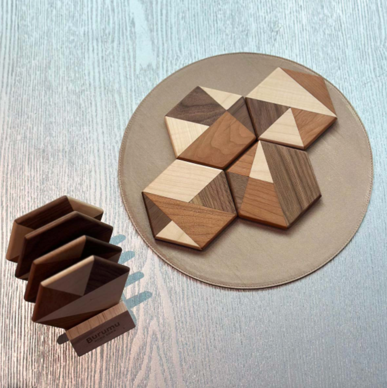 一套四款可雙面使用,每個都由五塊不同型狀的木片,設計像摺紙般組成六角形杯墊。
