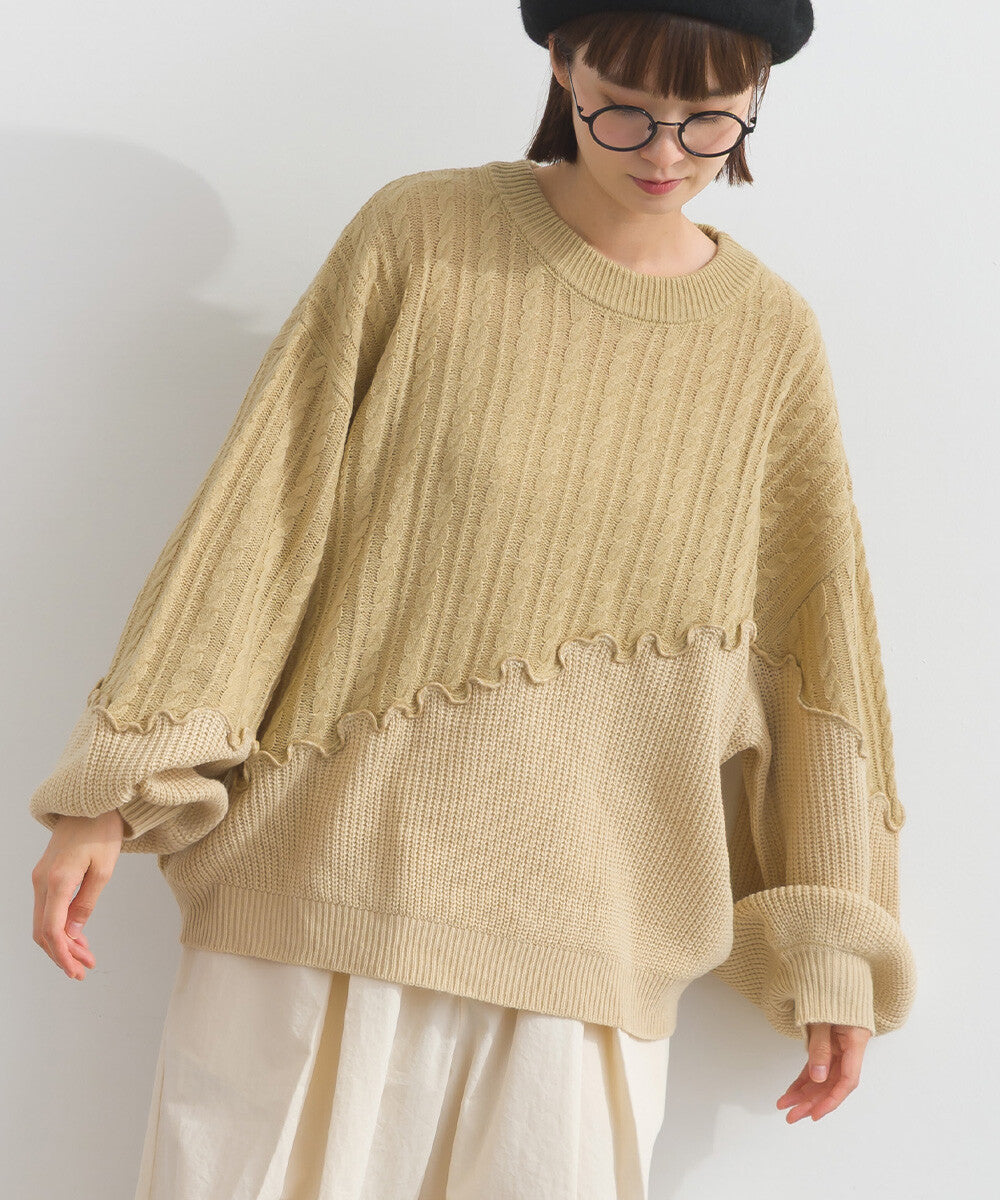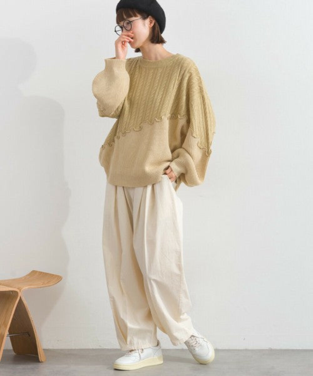 它由柔軟輕盈的腈綸紗線製成。上半身採用麻花針織,下半身則以單面針織,呈現不規則的明暗層次感。表面略微蓬鬆的質感,賦予服飾溫暖的秋冬氣息。紗線以略微寬鬆的針法編織,觸感柔軟親膚,即使長時間穿著也不會感到緊繃。下擺處柔和的波浪形收邊恰到好處,更添精緻感。