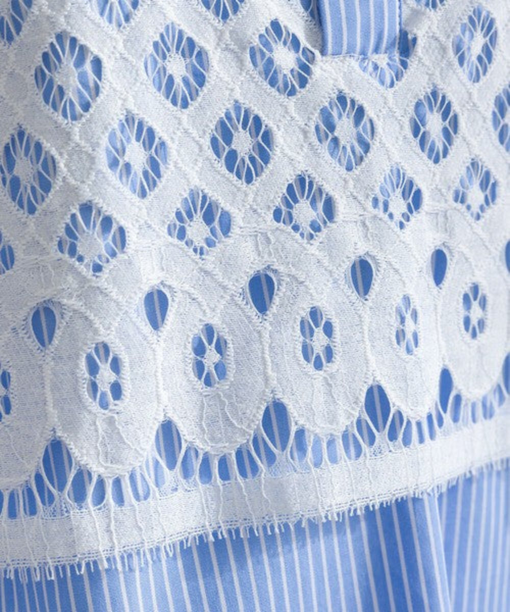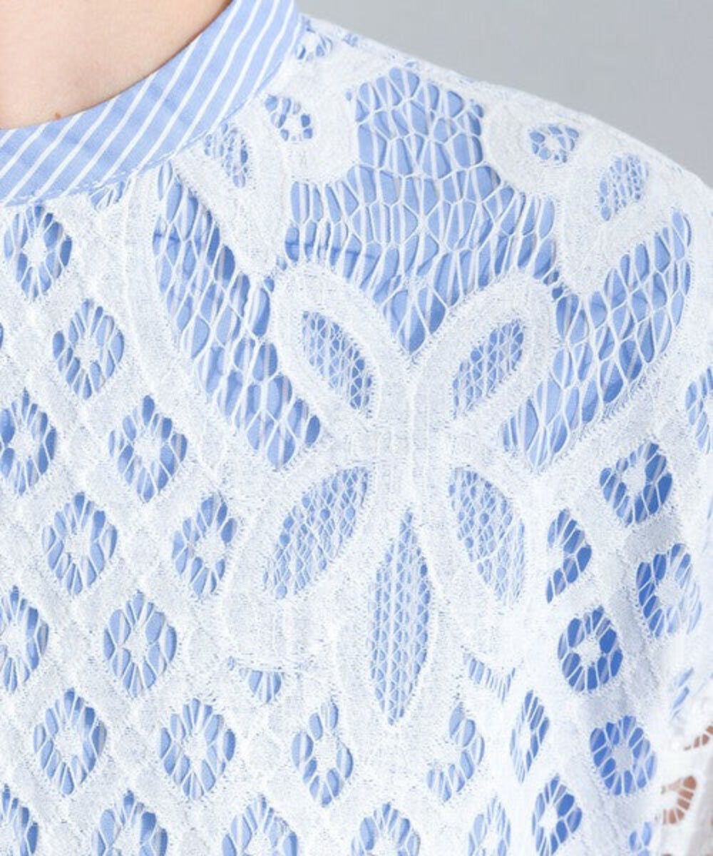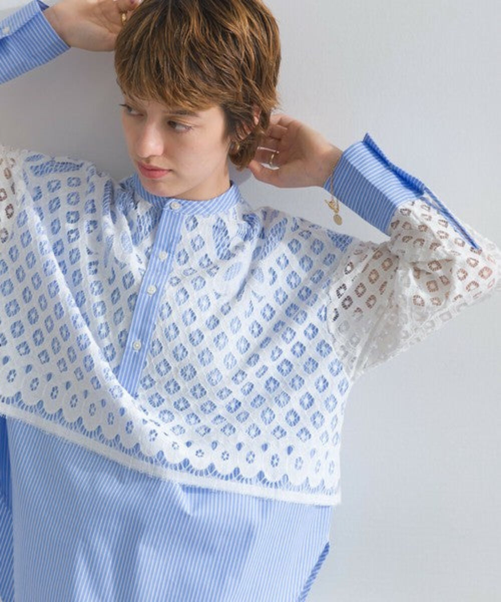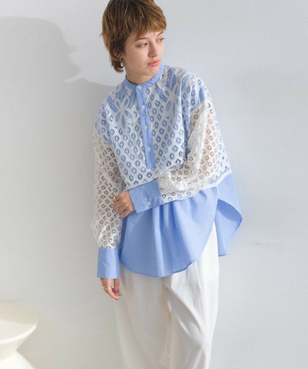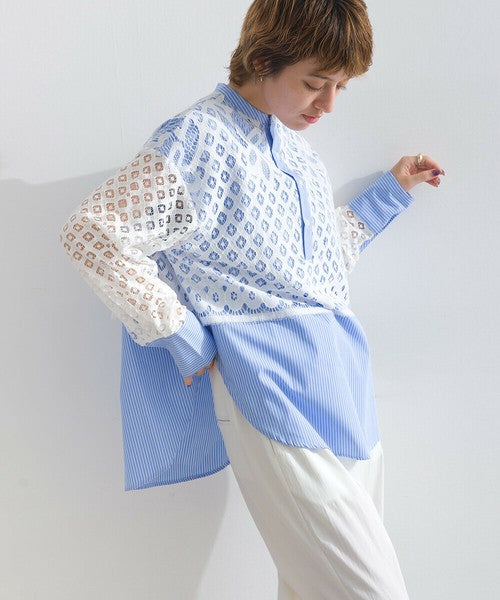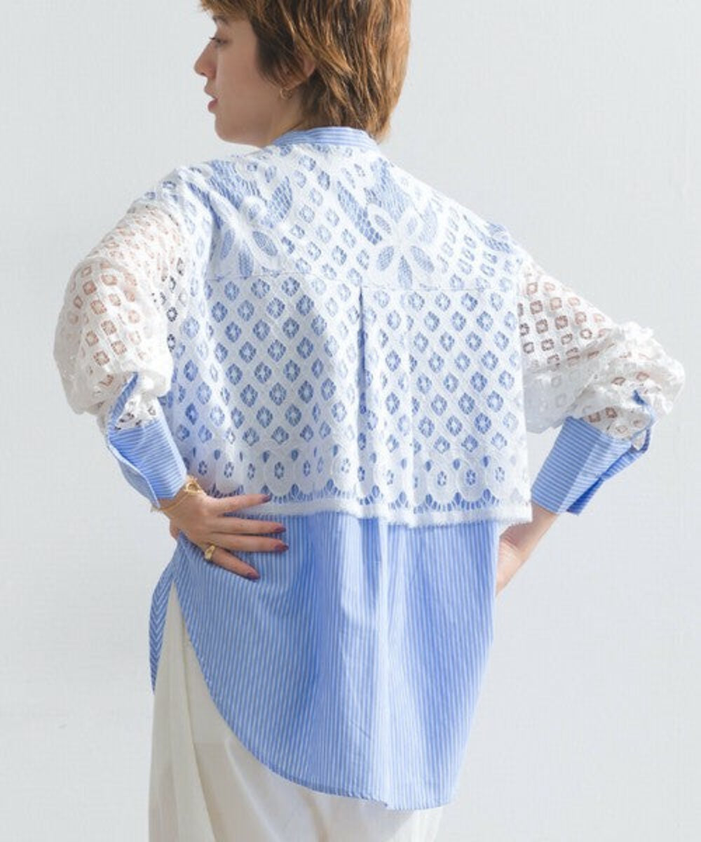 精緻的蕾絲裝飾著這款對接襯衫,既女性化又優雅。