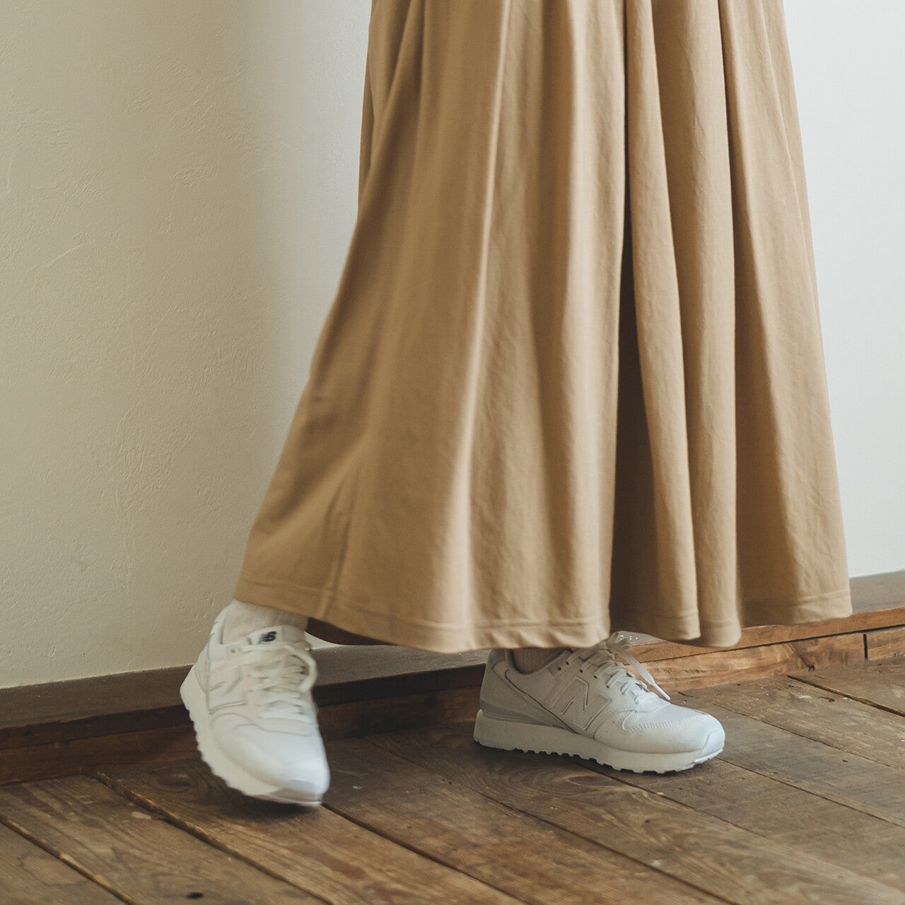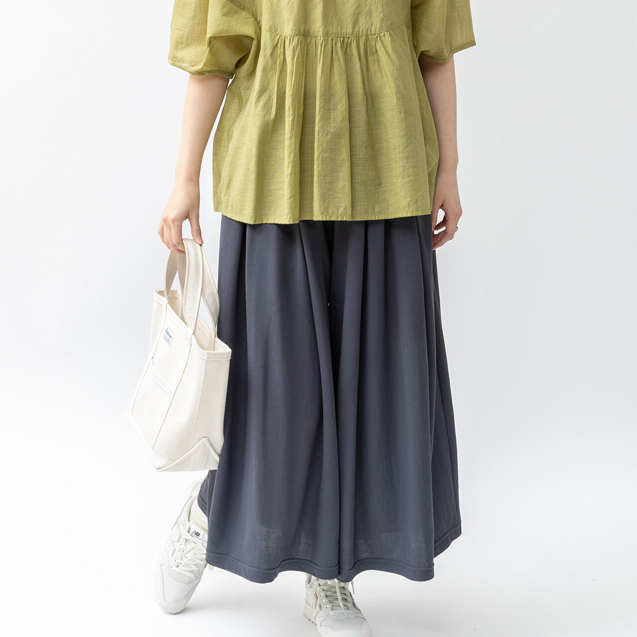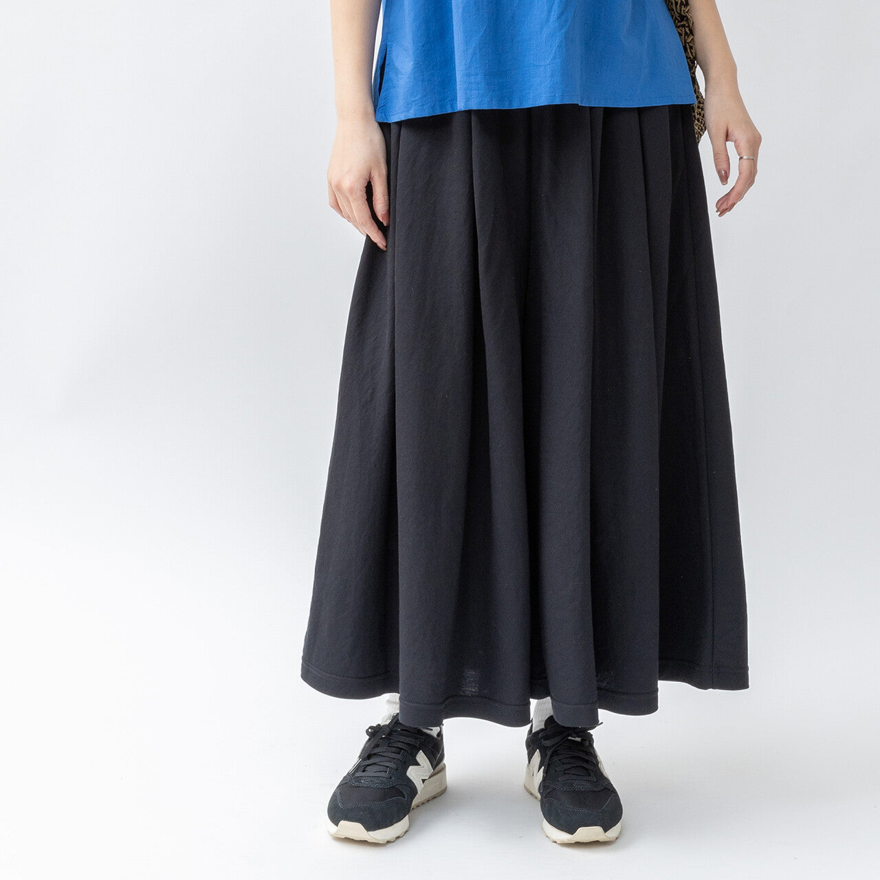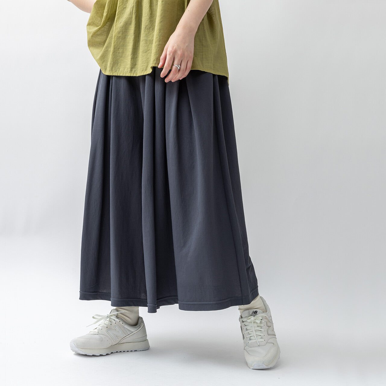 使用非常受歡迎的接觸冷卻材料。寬大的輪廓使其看起來像一條裙子,但材質具有寬鬆的感覺,因此不會過度伸展,使其成為一件易於搭配的單品。