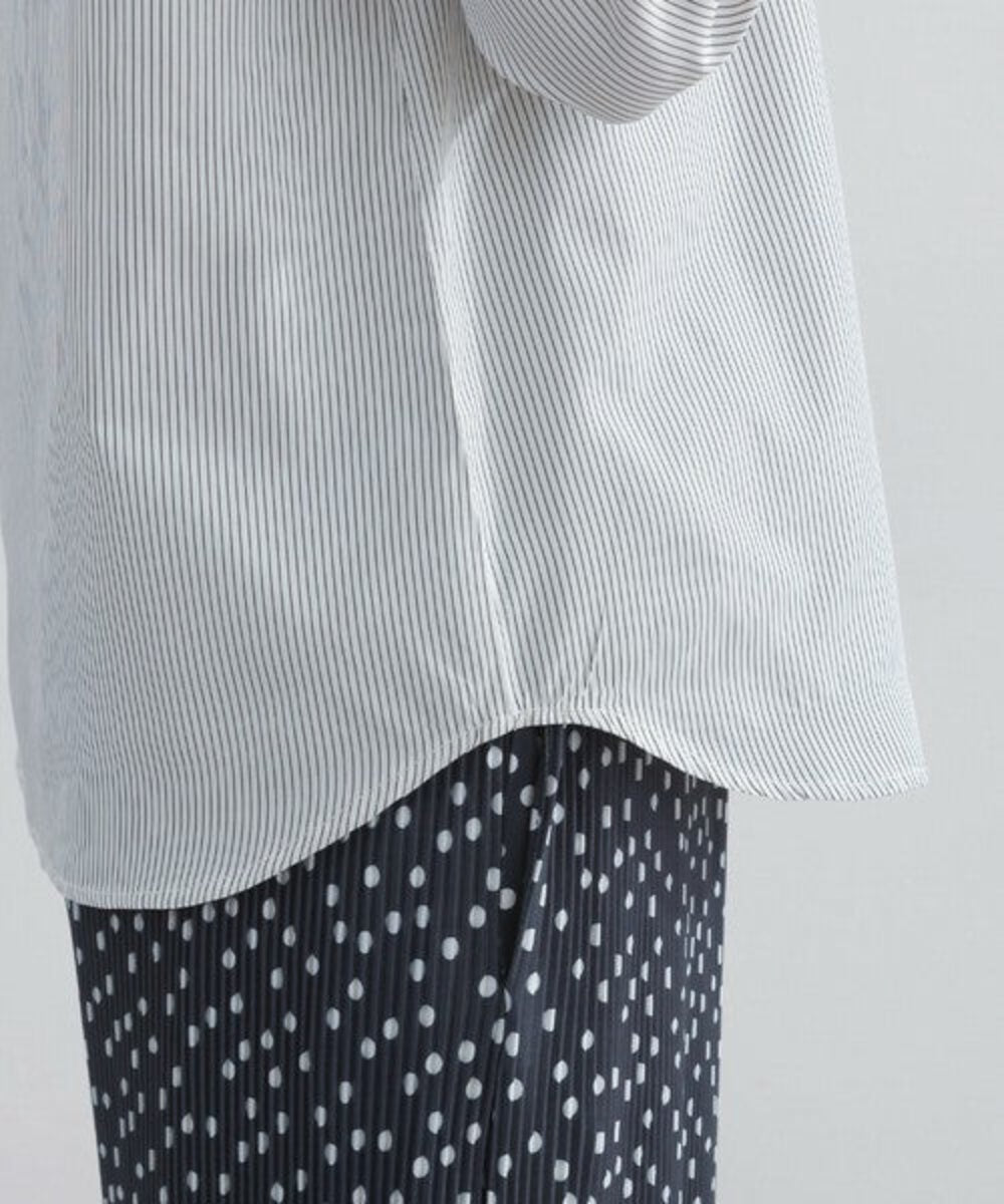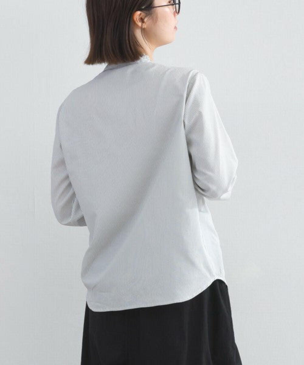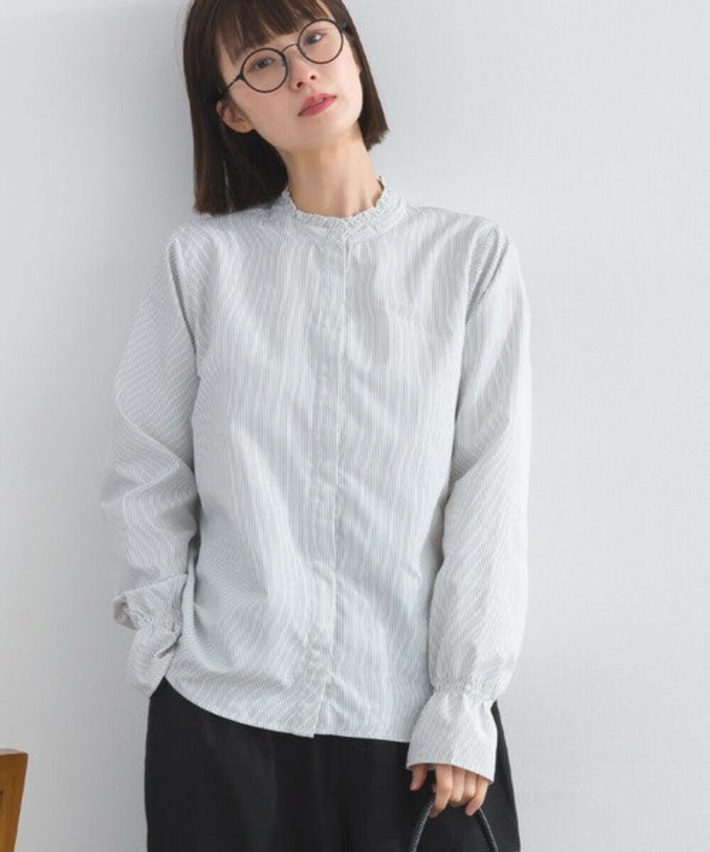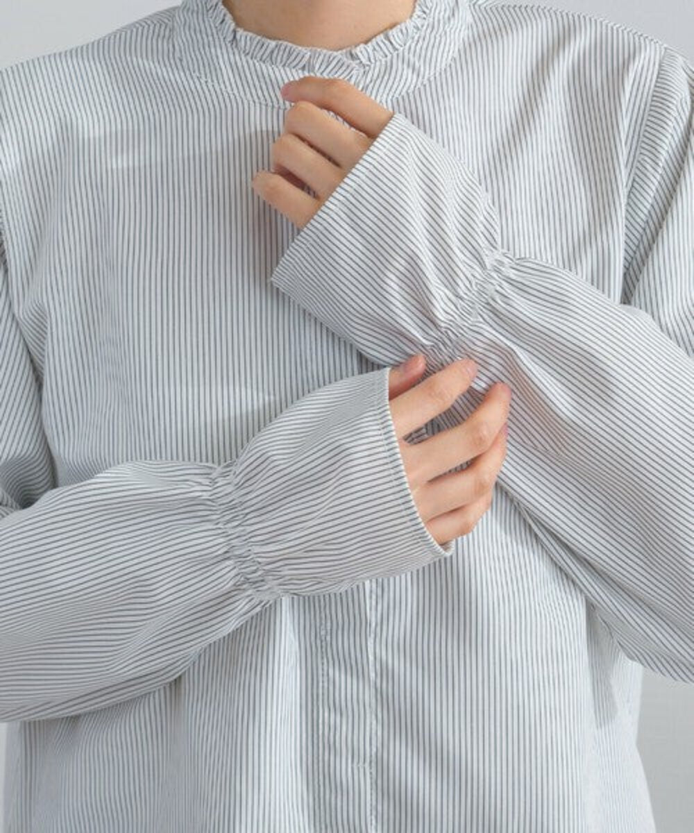 條紋圖案精緻細膩,營造出俐落輕盈的質感。袖口採用褶皺設計,搭配豐盈的袖口和略帶弧度的下擺。脖頸處流露出一絲甜美。領口周圍的荷葉邊更添優雅氣質。